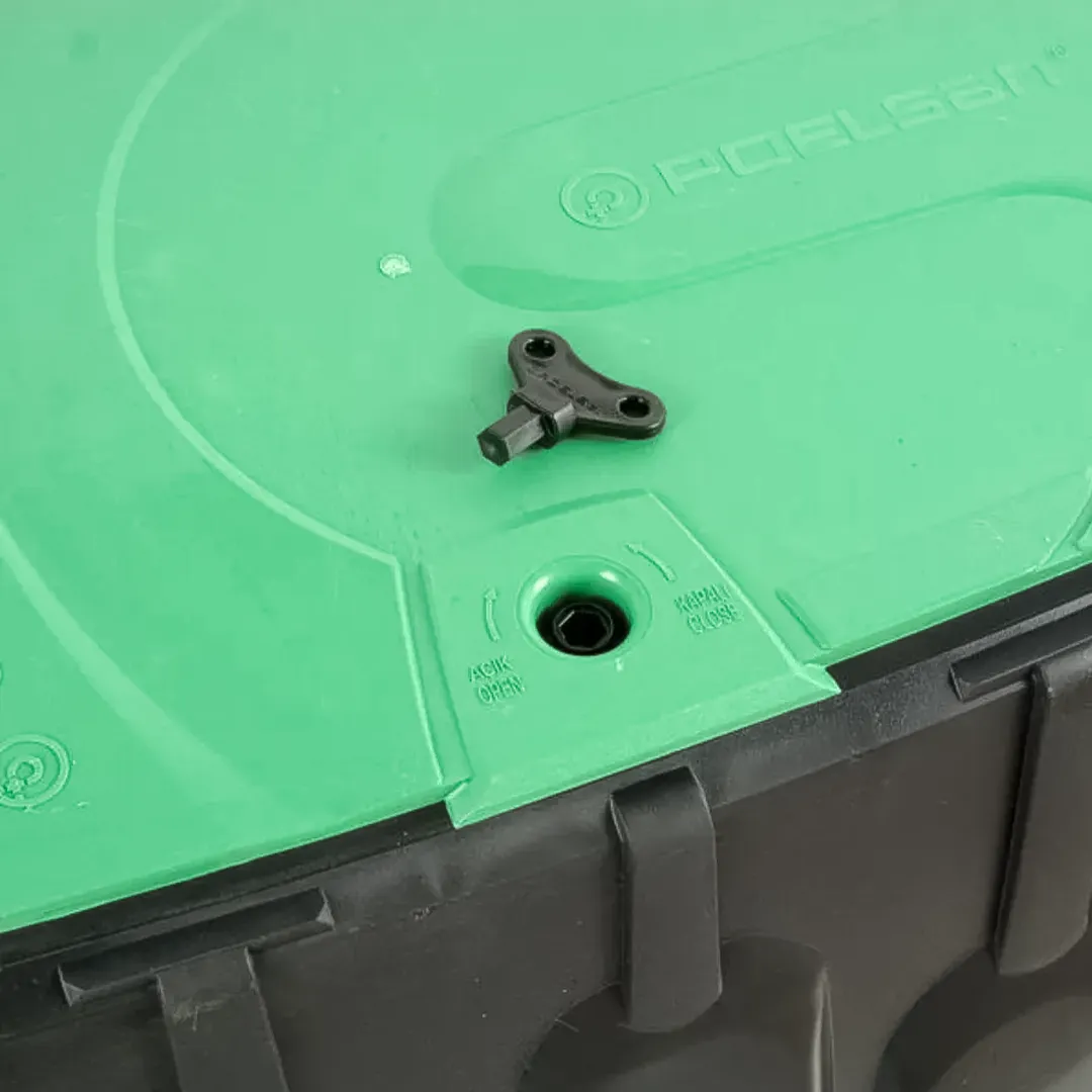 Материал: Прочный, жесткий пластик, устойчивый к деформации в грунте и климатическим воздействиям.Крышка: Зеленая, прямоугольная, с замком под шестигранный/пластиковый ключ для защиты от несанкционированного доступа.