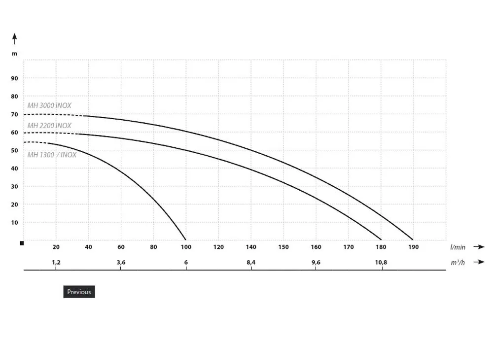 Графические характеристики поверхностного насоса IBO MH 1300 INOX (230V) (IBO))
