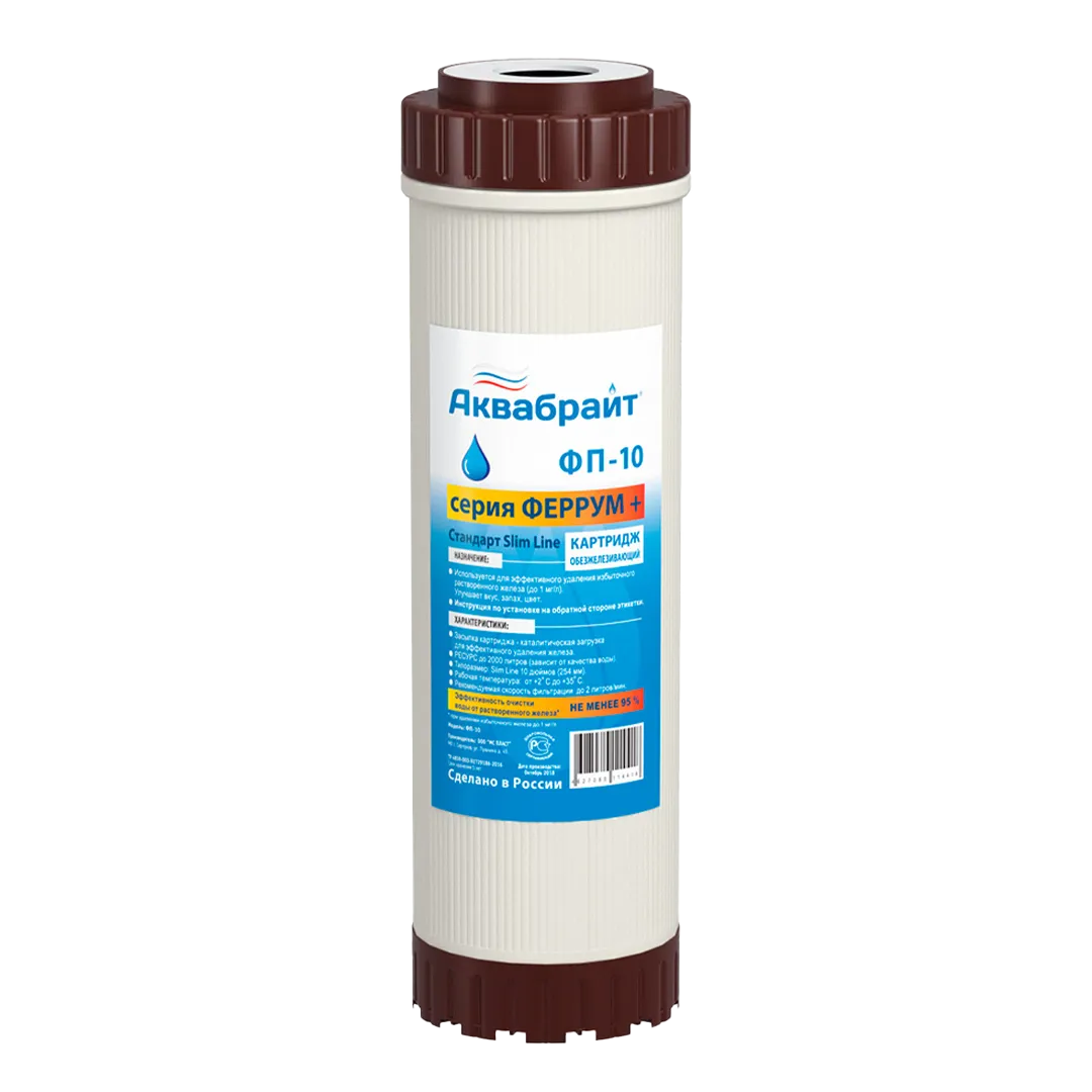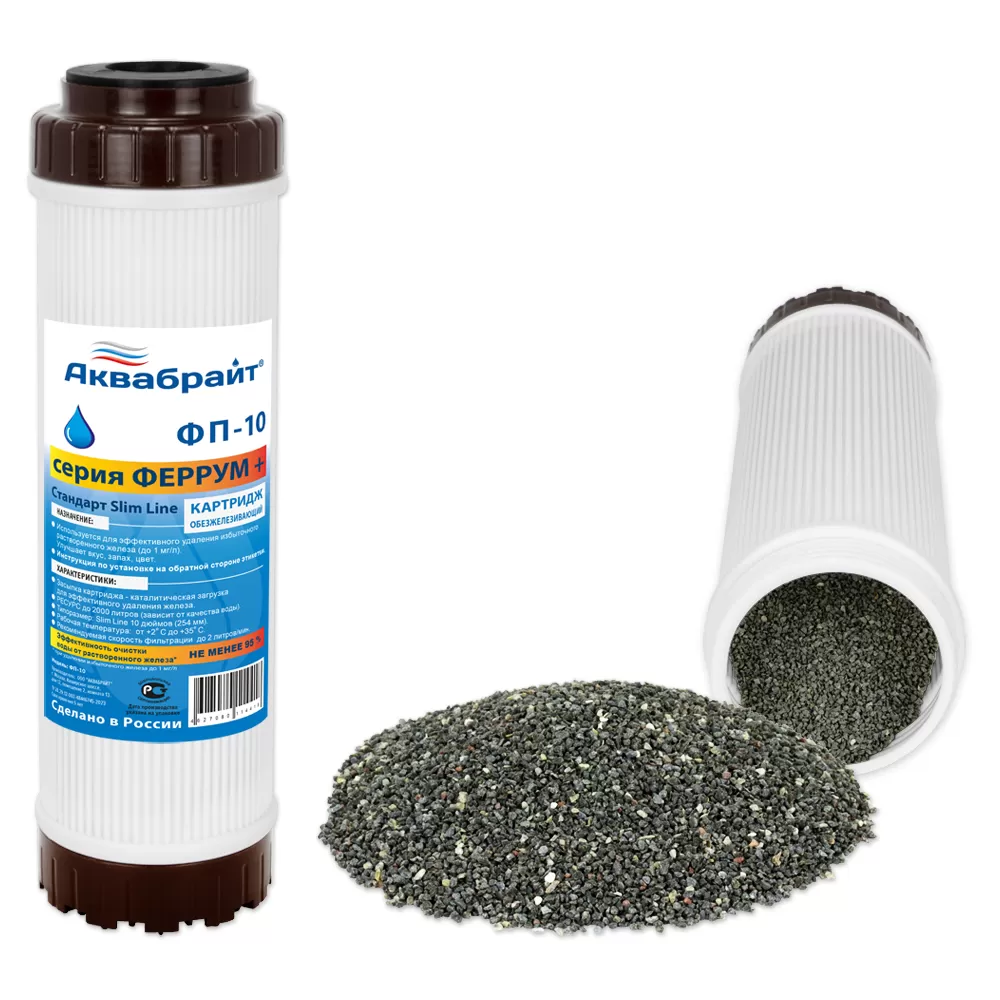 Картридж АКВАБРАЙТ ФП-10 с засыпанным в корпус окислителем МЖФ. Предназначен для очистки воды от растворенного железа, органических соединений.