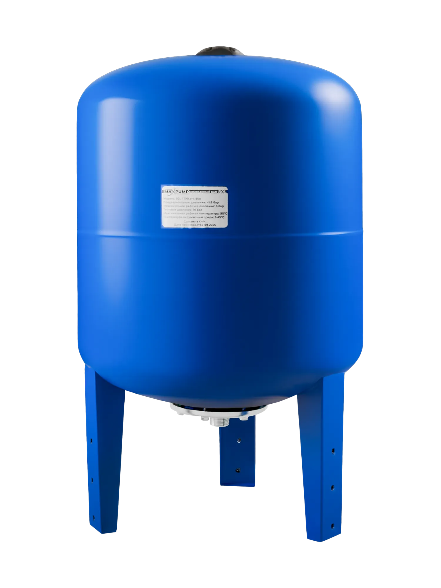 Мембранные баки MAXPUMP оснащаются рабочим штуцером диаметром 1". Рекомендуемый диапазон температур составляет от 0 до 45 C°, исходное давление 1.8 бар, максимальное тестовое давление до 10 бар.