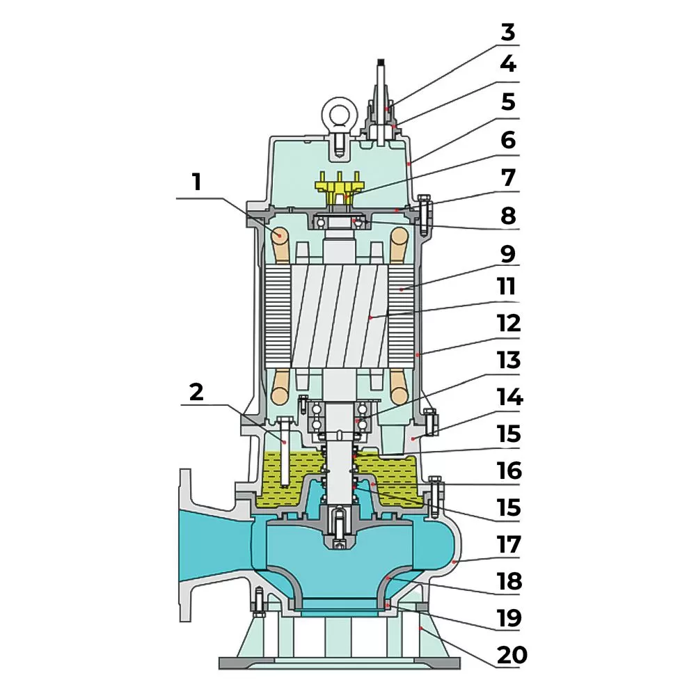 Режим работы насоса — непрерывный (S1), что позволяет ему функционировать без перерывов, а степень защиты IP68 и класс изоляции F гарантируют надёжность работы в сложных условиях. Такой насос оптимален для эксплуатации в очистных сооружениях, на промышленных предприятиях, в коммунальных системах водоотведения и на строительных площадках.