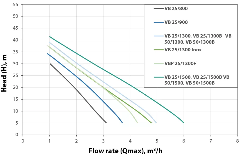 Графические характеристики насосной станции Elpumps VB 25/1300 INOX