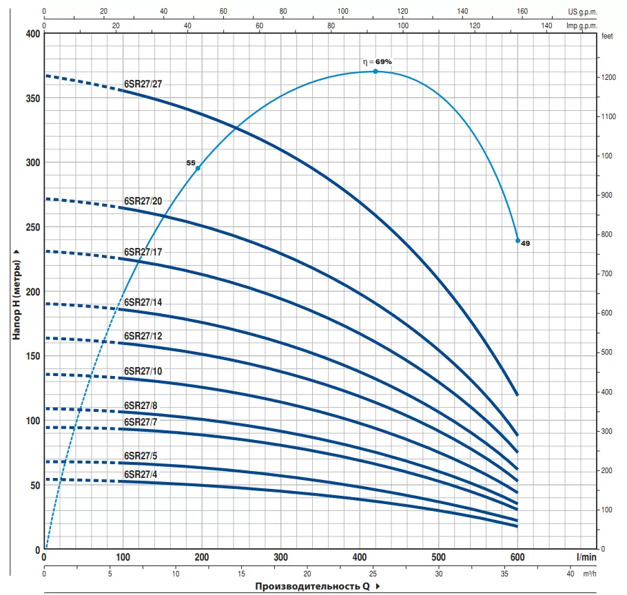 Глубинный насос Pedrollo 6SR27/27-P, отличается объективной ценой и надежной работой всех исполнительных механизмов. Насос Pedrollo 6SR27/27-P достаточно простой в эксплуатации и обслуживании, поэтому отлично подходит как для домашнего, так и промышленного применения.В основе работы Pedrollo 6SR27/27-P лежит конструктивно простой, но функционально успешный многоступенчатый центробежный принцип. Электрический двигатель подключается к агрегату через суппорт, в соответствии с нормативами международного стандарта NEMA. Мощность электродвигателя насоса составляет 30000 Вт . И при таких показателях мощности насос обладает максимальным напором в 367 метров и максимальной производительностью 36 м3/час. Функционирование Pedrollo 6SR27/27-P идентично большинству устройств, основанных на центробежных механизмах подачи воды. Жидкость втягивается в корпус устройства благодаря центробежной силе, создаваемой рабочими колесами, которые также проталкивают воду через все тело насоса "диаметр насоса 6"", а затем в нагнетающий патрубок "диаметр патрубка 3"", через который вода и попадает к конечному потребителю. Главной особенностью насоса Pedrollo 6SR27/27-P является малый диаметр корпуса агрегата, а также то, что перекачиваемая вода не касается стенок двигателя. Между жидкостью и корпусом движущей установки располагается прослойка из технологического масла, которая и предотвращает попадание мелких частиц непосредственно в исполнительный механизм. В то время как охлаждение электропривода происходит за счет верхнего способа забора воды, т.е. перекачиваемая жидкость находится всегда выше уровня расположения двигателя. Насос питается от сети в 380 в и комплектуется кабелем 4 метров.